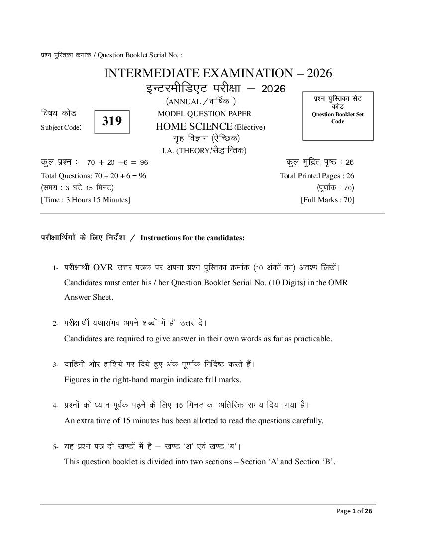 Bihar Board Class 12th Model Paper 2026 Home Science View Download