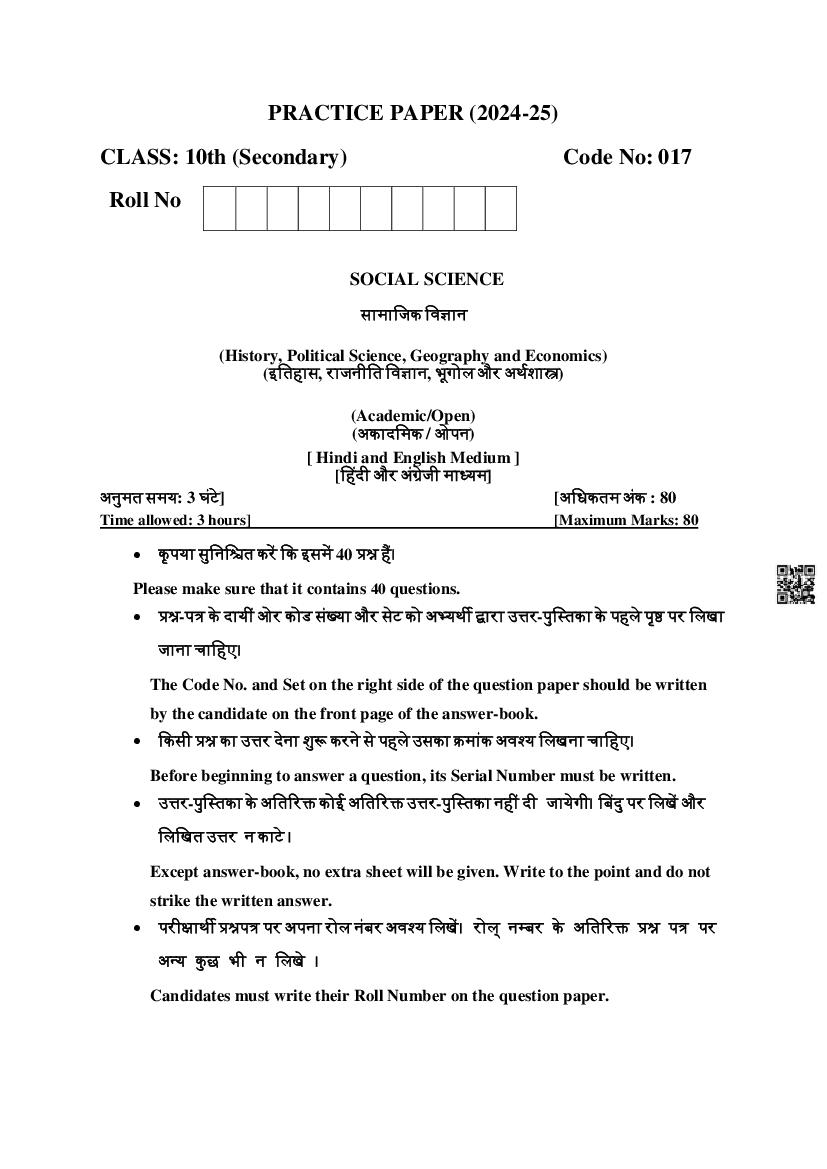 हरियाणा बोर्ड 10वीं सामाजिक विज्ञान मॉडल पेपर 2025 PDF
