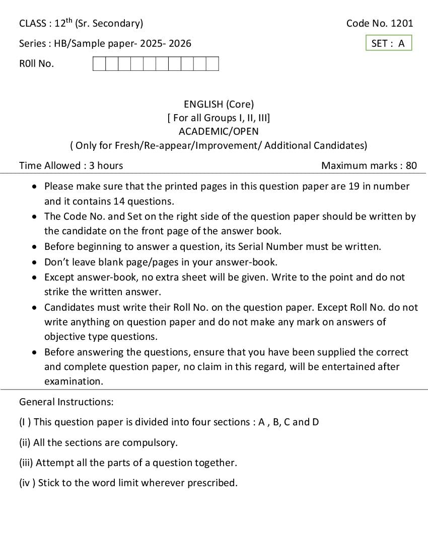 हरियाणा बोर्ड 12वीं अंग्रेज़ी मॉडल पेपर 2026 – जरूरी बातें