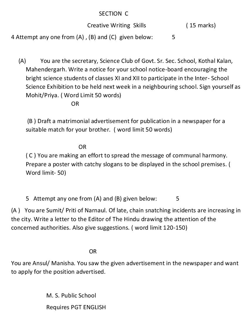 हरियाणा बोर्ड 12वीं अंग्रेज़ी मॉडल पेपर 2026
