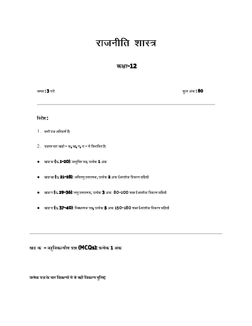 हरियाणा बोर्ड 12वीं राजनीतिक विज्ञान मॉडल पेपर 2026 PDF