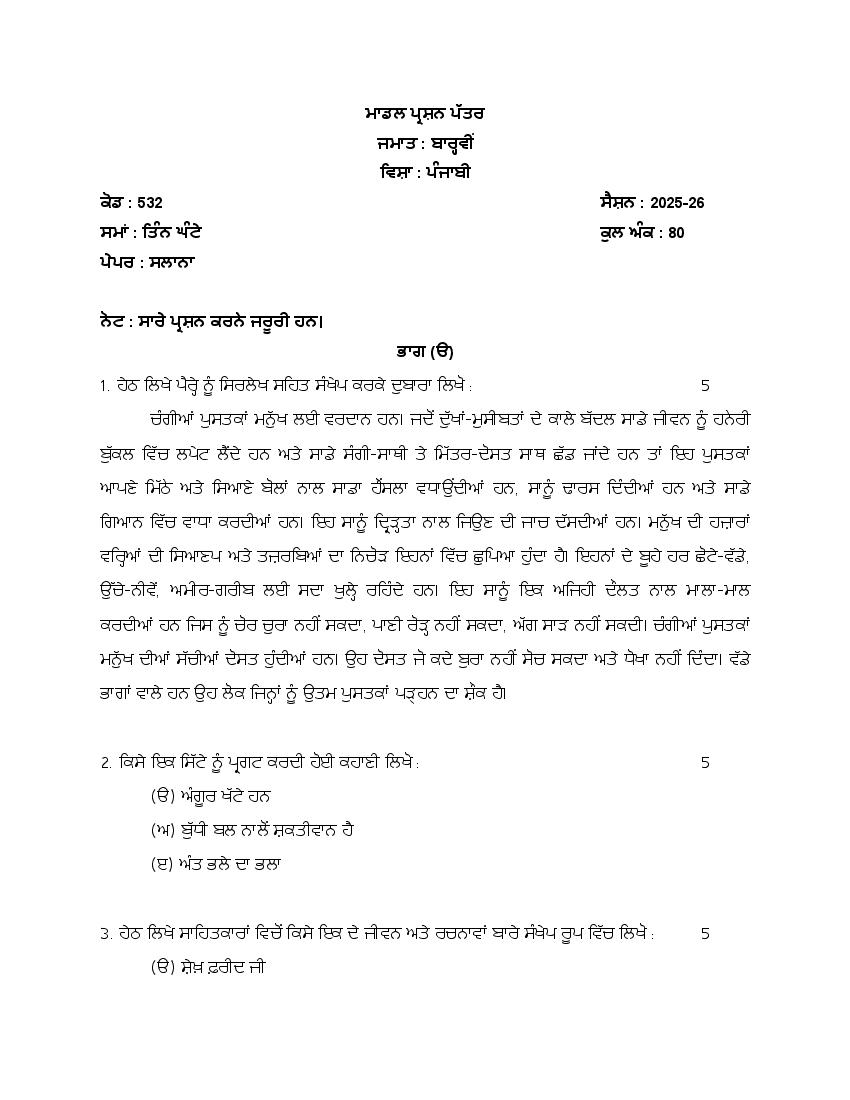 हरियाणा बोर्ड 12वीं पंजाबी मॉडल पेपर 2026