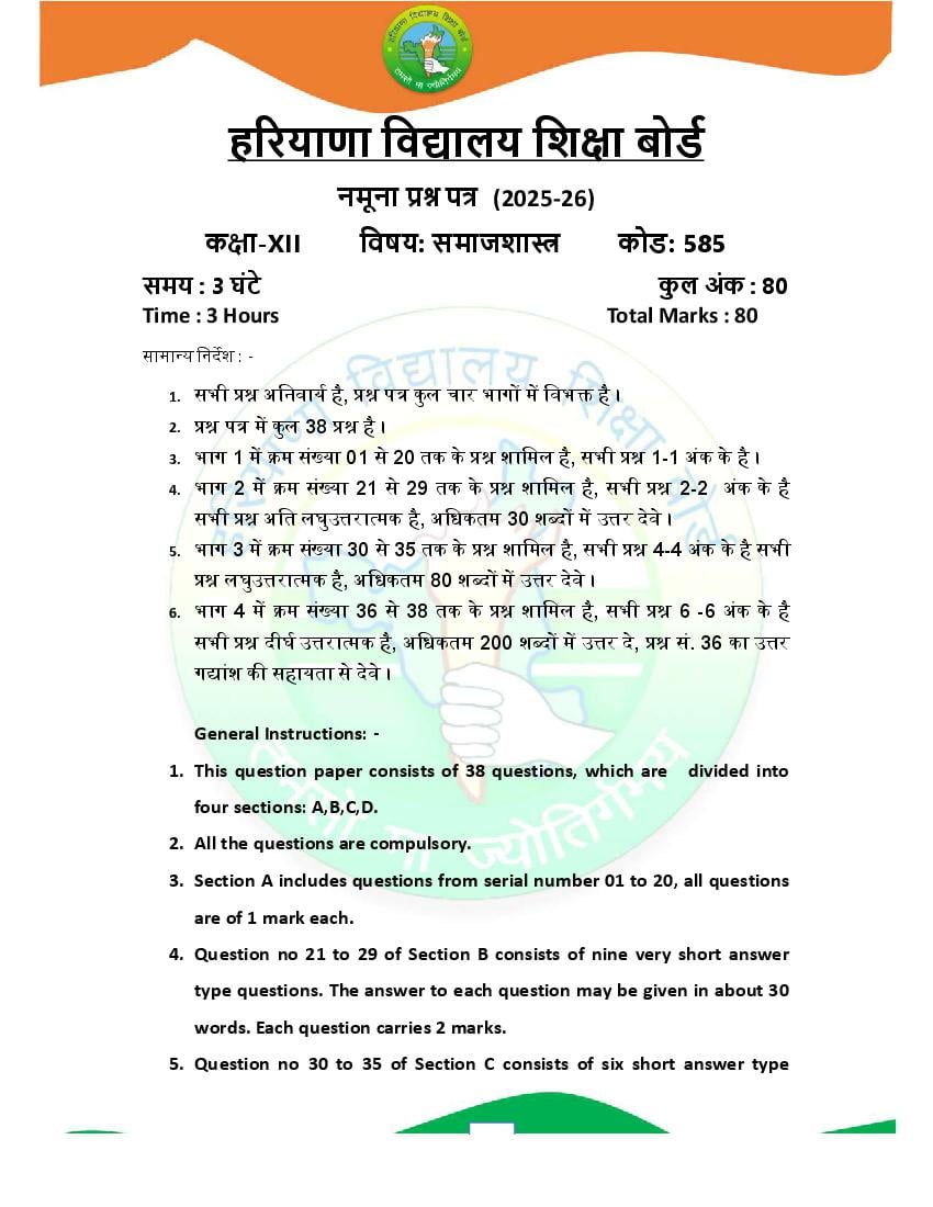 हरियाणा बोर्ड 12वीं समाज शास्त्र मॉडल पेपर 2026 – डाउनलोड करने के लिए यहा क्लिक करे