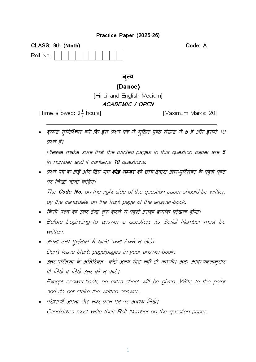HBSE Class 9 Sample Paper 2026 Dance View Download
