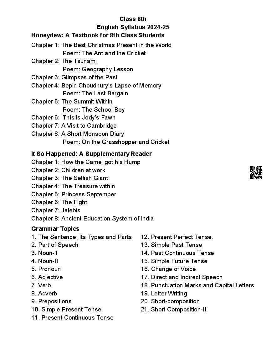 अंग्रेज़ी के पाठ्यक्रम को पूरा करने के लिए आपको HPBOSE द्वारा कक्षा 8 के लिए निर्धारित पुस्तकों को पढ़ना होता है। इन पुस्तकों मे 8वीं के अंग्रेज़ी स्तर के अलग-अलग अध्याय, जिनमे पाठ व अभ्यास, प्रश्नावली है।