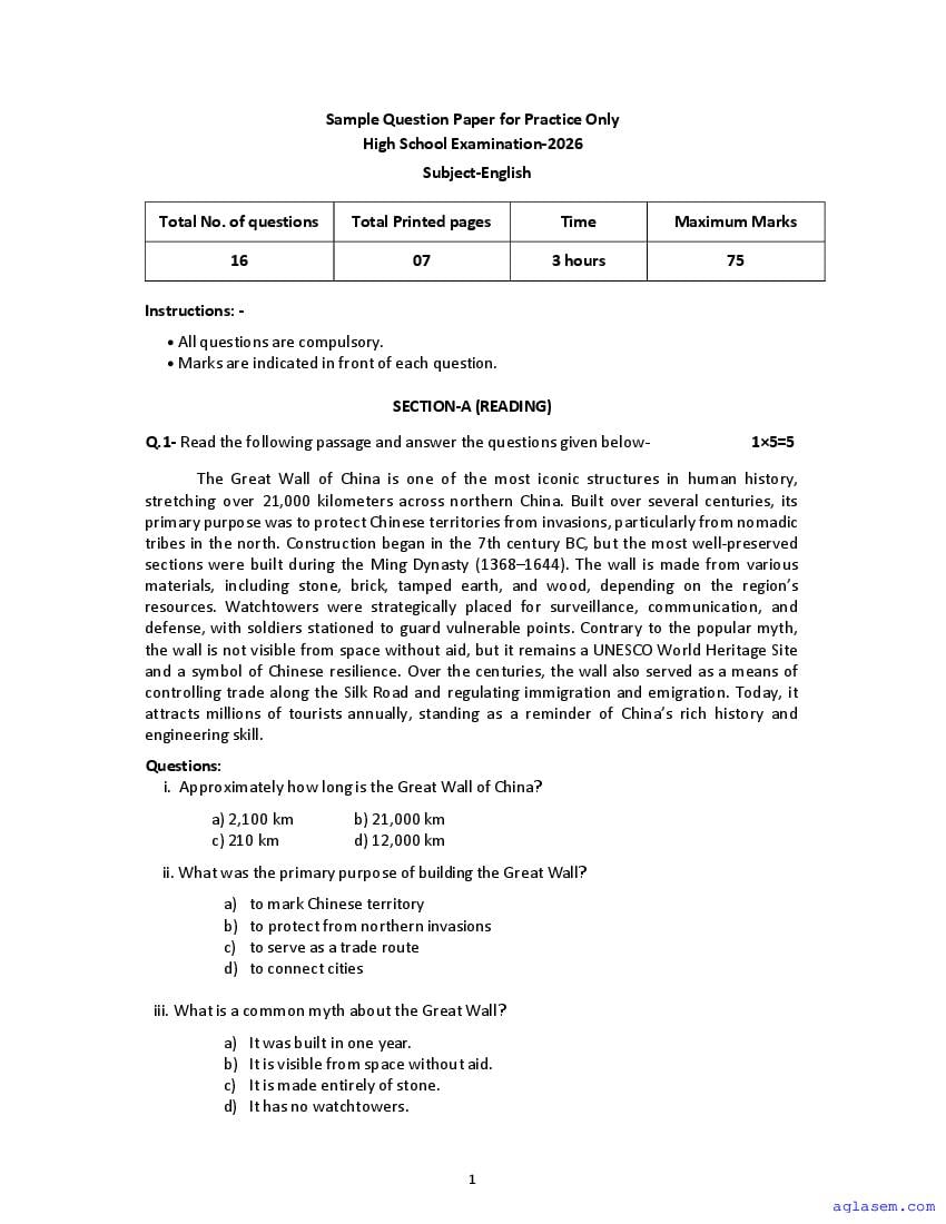 यदि आप एमपी बोर्ड कक्षा 10 के रिजल्ट 2026 मे उत्तीर्ण होना चाहते है, तो मध्य प्रदेश बोर्ड 10वीं अंग्रेज़ी सैंपल पेपर (Madhya Pradesh Board 10th English Model Paper) के साथ ही अपने हर विषय के एमपी बोर्ड 10वीं मॉडल पेपर (Madhya Pradesh Board Class 10 Model Paper) का हल करे:
