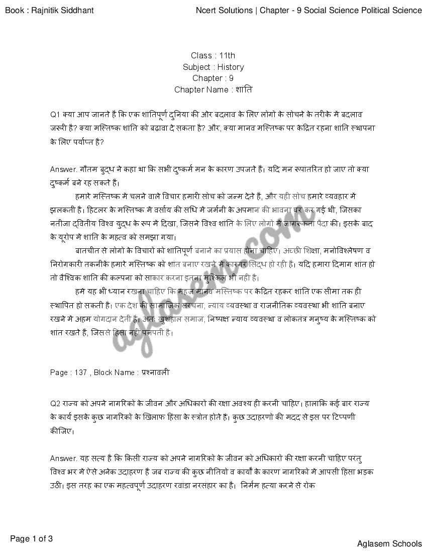 “शांति” के नाम वाला पाठ आप कक्षा 11 मे पढ़ते है। यह राजनीति विज्ञान (Political Science) का एक महत्वपूर्ण भाग है। एनसीईआरटी की पुस्तक “राजनीतिक सिद्धांत” मे इसको बहुत अच्छी तरह से समझाया है। साथ ही, पाठ मे अलग अलग अभ्यास के तौर पे अध्याय 9 से प्रश्न पूछे गए है।