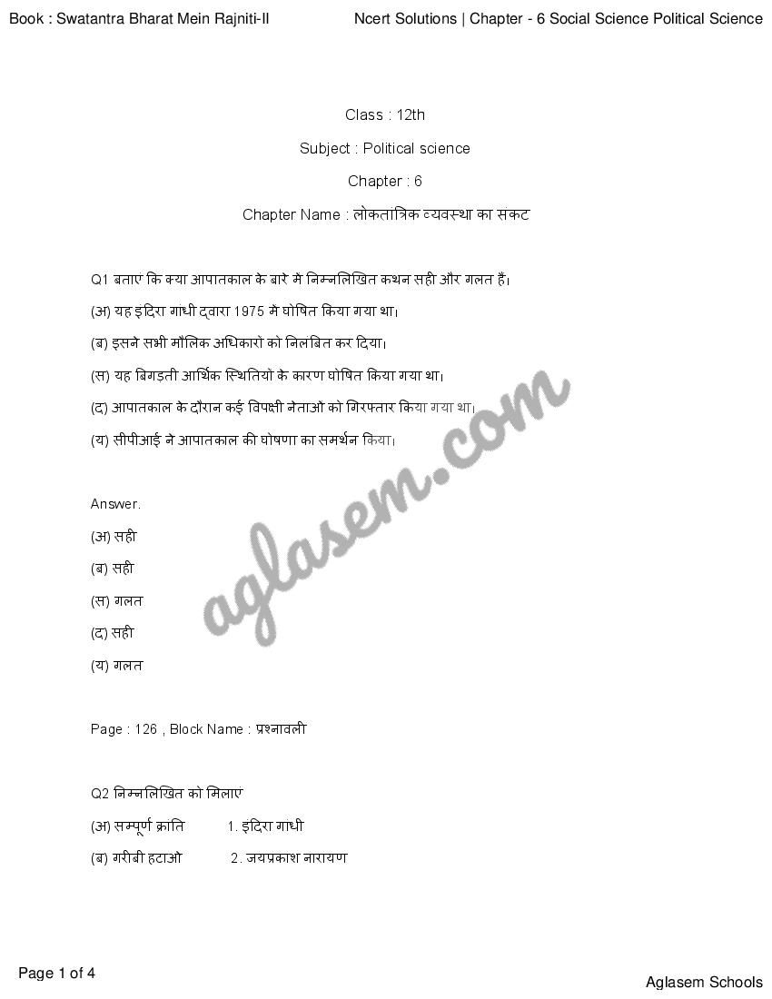 यदि आप बारहवीं कक्षा मे है, तो राजनीति विज्ञान विषय के एनसीईआरटी पुस्तक (स्वतंत्र भारत में राजनीति) के पाठ 6 को पढ़ेंगे जिसका नाम है लोकतांत्रिक व्यवस्था का संकट। इस अध्याय 6 के सारे प्रश्नों के उत्तर आपको यहा दिए गए कक्षा 12 एनसीईआरटी समाधान (NCERT Question Answer for Class 12) मे मिल जाएंगे।