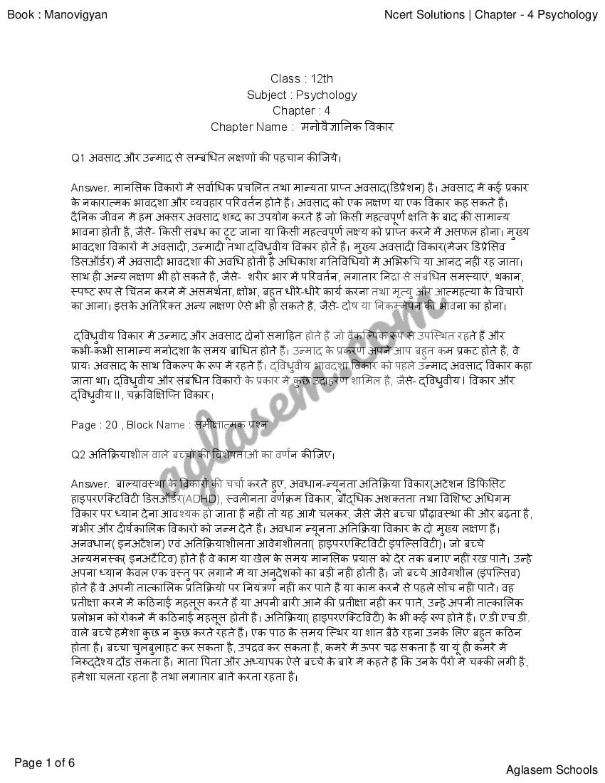 “मनोवैज्ञानिक विकार” के नाम वाला पाठ आप कक्षा 12 मे पढ़ते है। यह मनोविज्ञान (Psychology) का एक महत्वपूर्ण भाग है। एनसीईआरटी की पुस्तक “मनोविज्ञान” मे इसको बहुत अच्छी तरह से समझाया है। साथ ही, पाठ मे अलग अलग अभ्यास के तौर पे अध्याय 4 से प्रश्न पूछे गए है।