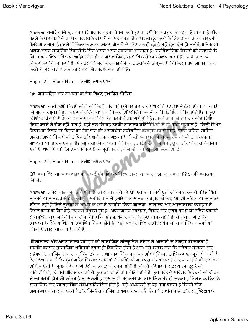 एनसीईआरटी कक्षा 12 मनोविज्ञान के इस चैप्टर के प्रश्नों का हल करने के लिए सबसे पहले आप कक्षा 12 की मनोविज्ञान की किताब को पढ़े। फिर मनोवैज्ञानिक विकार के नोट्स देखे। उसके बाद कक्षा 12 मनोविज्ञान एनसीईआरटी समाधान देखे, जिसमे इस अध्याय 4 के सारे प्रश्नों के उत्तर दिए हुए है।