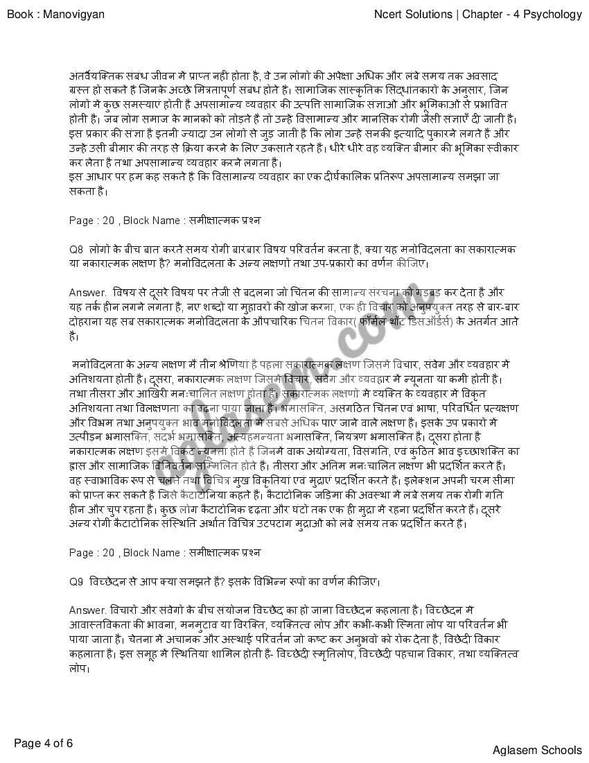 एनसीईआरटी समाधान कक्षा 12 मनोविज्ञान अध्याय 4 (NCERT Solutions for Class 12 Psychology Chapter 4) अब aglasem द्वारा मनोवैज्ञानिक विकार के हर प्रश्नावली के लिए प्रस्तुत है। इसलिए आप यहा कक्षा 12 मनोविज्ञान अध्याय 4 प्रश्न उत्तर का pdf डाउनलोड कर सकते है। इस कक्षा 12 एनसीईआरटी मनोविज्ञान समाधान मे बारहवीं क्लास की एनसीईआरटी की पुस्तक, जिसका नाम है मनोविज्ञान, उसके पाठ 4 के सारे सवालों के जवाब हिन्दी मे लिखे है।