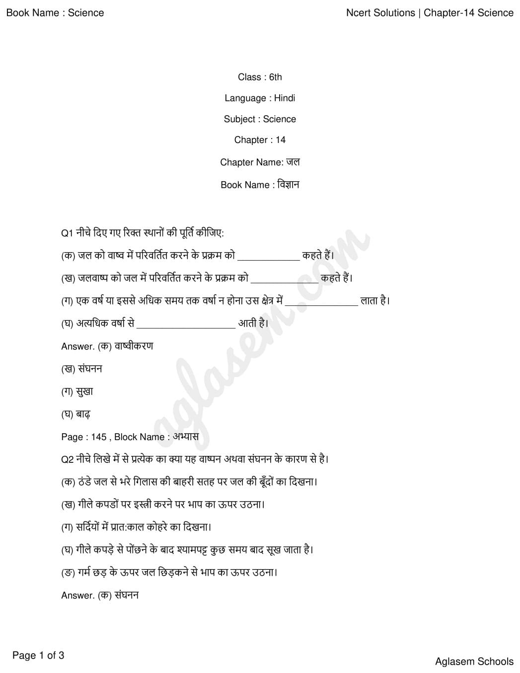 एनसीईआरटी समाधान कक्षा 6 विज्ञान अध्याय 14 जल PDF