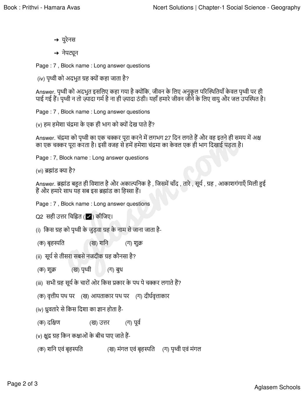 एनसीईआरटी समाधान कक्षा 6 सामाजिक विज्ञान अध्याय 1 (NCERT Solutions for Class 6 Social Science Chapter 1) अब aglasem द्वारा सौरमंडल में पृथ्वी के हर प्रश्नावली के लिए प्रस्तुत है। इसलिए आप यहा कक्षा 6 सामाजिक विज्ञान अध्याय 1 प्रश्न उत्तर का pdf डाउनलोड कर सकते है। इस कक्षा 6 एनसीईआरटी सामाजिक विज्ञान समाधान मे छठी क्लास की एनसीईआरटी की पुस्तक, जिसका नाम है पृथ्वी: हमारा आवास, उसके पाठ 1 के सारे सवालों के जवाब हिन्दी मे लिखे है।